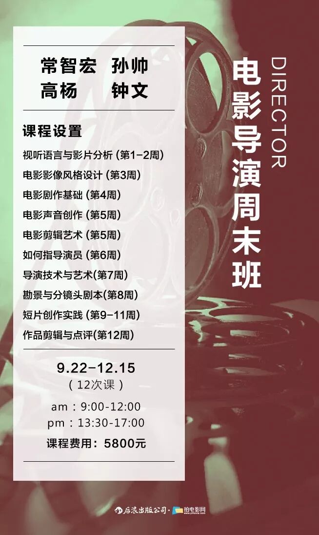 黄金九月,电影导演周末班,由著名讲师 / 导演 常智宏,青年导演 / 编剧 孙帅、摄影师 高杨,声音创作及理论硕士 钟文四位老师主讲,由于导演创作剧本或筹备拍摄阶段就会介入这一项目,直到后期制作完成才放手。故而,导演可能涉足一部电影的方方面面,对于剧本的阐释、场面的调度、镜头的拆分、以及对于演员表演的校正等,都是导演职责的一部分。因此,我们的目标是,综述这些因素如何共同作用,以推进导演技能。