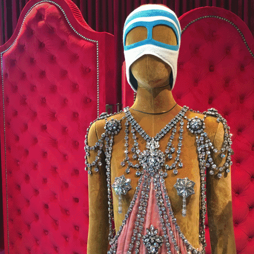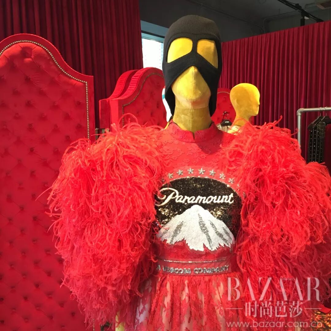 Alessandro Michele也有向派拉蒙电影公司(Paramount)致敬,华丽的羽毛装饰与Paramount LOGO组合而成的礼服,将电影中的华丽隐喻在时装之中。