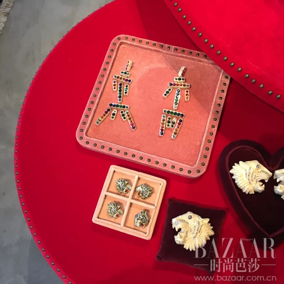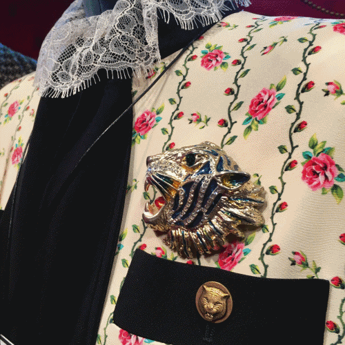 在整个系列中,十分精致有趣的虎头装饰,点缀在腰带、项链、包扣及胸针上,它的灵感其实来源于上世纪美国珠宝设计师的作品。Alessandro Michele将这微妙的小细节融入到秋冬季多元化的风格之中。