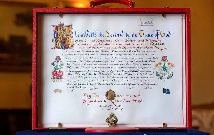 前几天白金汉宫就已经晒出了女王批准哈利和马克尔结婚的超精致结婚文件