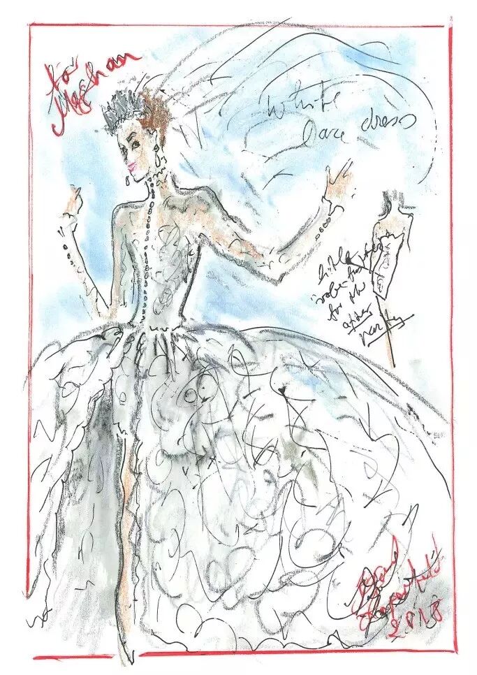 老佛爷 Karl Lagerfeld 笔下的 Meghan,不对称式的裙摆剪裁使华丽中了分俏皮,从腰间延伸到颈部的纽扣使脖子显得无比修长
