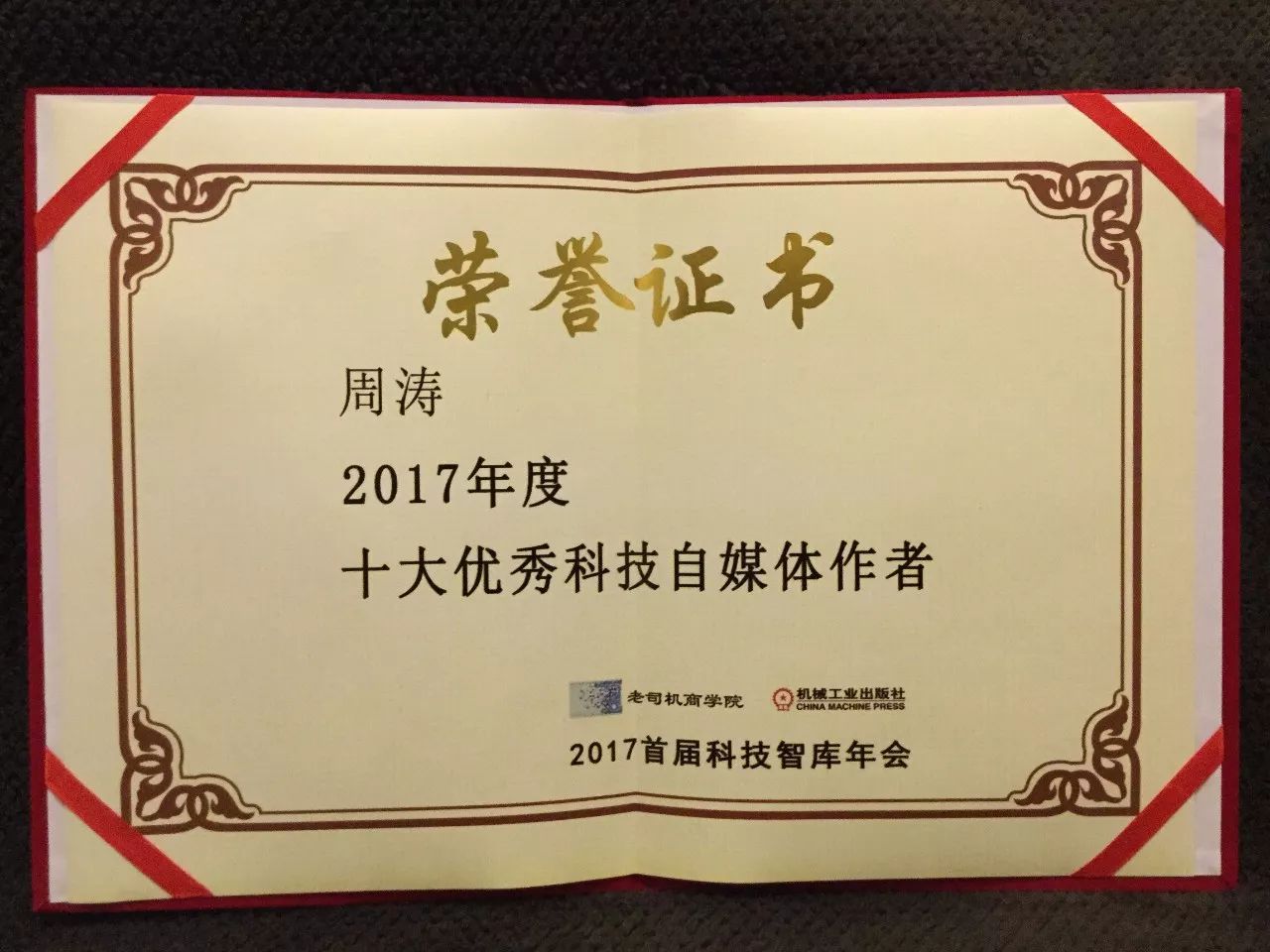 12月22日,机械工业出版社与老司机商学院携手举办首届科技智库年会,IT三剑客创始人周涛被评为“2017年度十大科技自媒体优秀作者”。