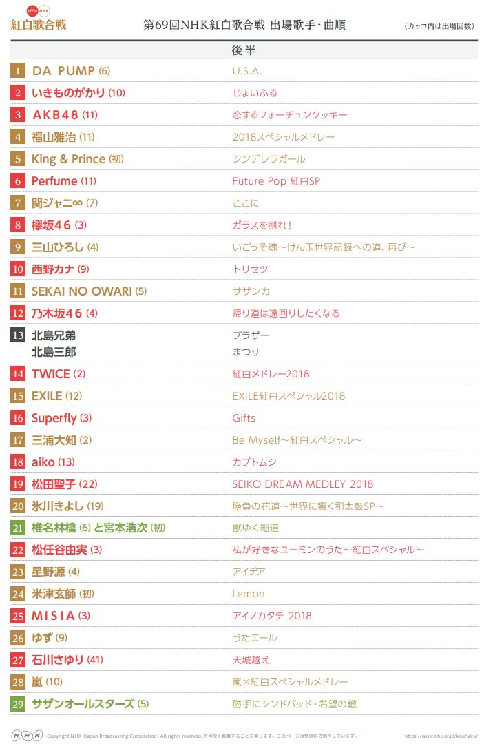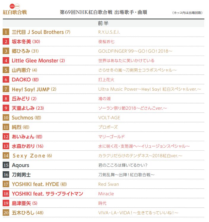 红组歌手:aiko、あいみょん、AKB48、丘みどり、欅坂46、島津亜矢、DAOKO、西野カナ、Perfume、Little Glee Monster