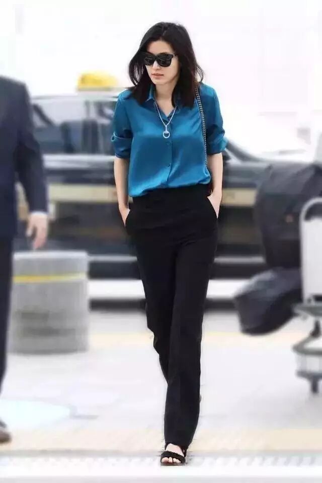 蓝色衬衫搭配黑色直筒裤,高腰拉长了腿部线条,穿上身非常帅气干练。