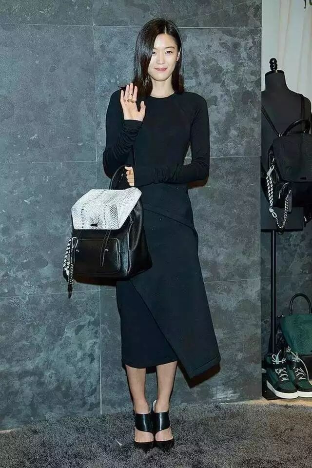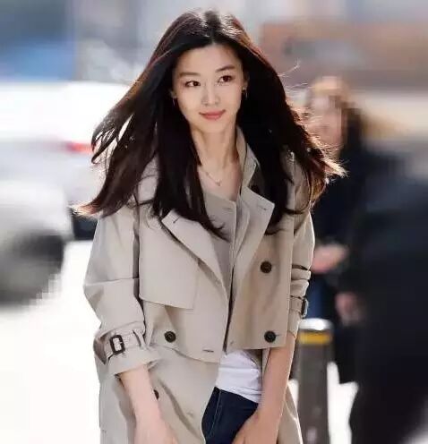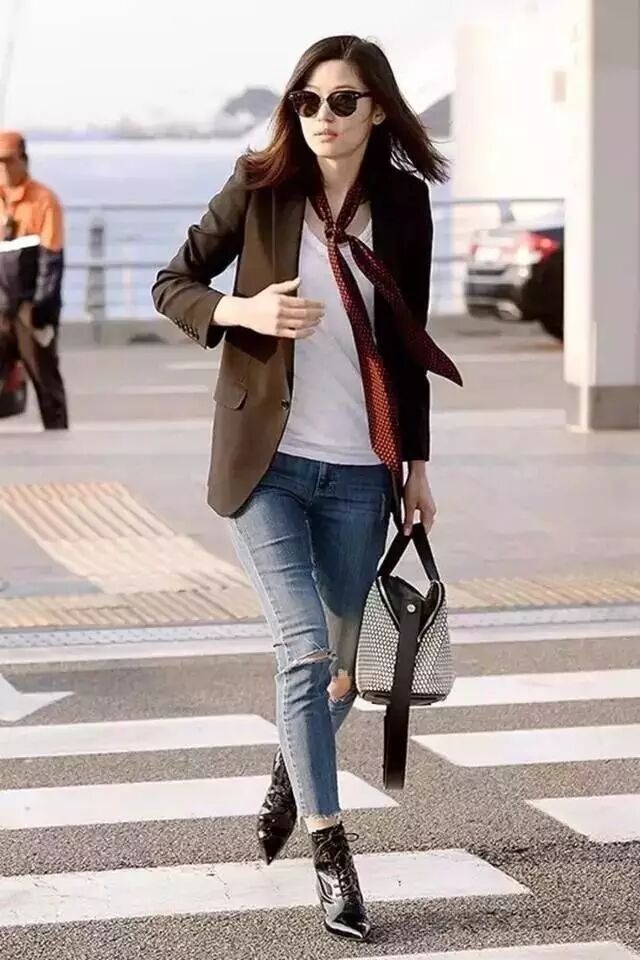全智贤穿白色上衣搭黑色西装夹克,经典的黑白搭配,用红色波点细丝巾点缀上身,非常有亮点,下搭破洞牛仔裤和尖头黑皮靴,穿上身简约干净大方,十分酷帅!