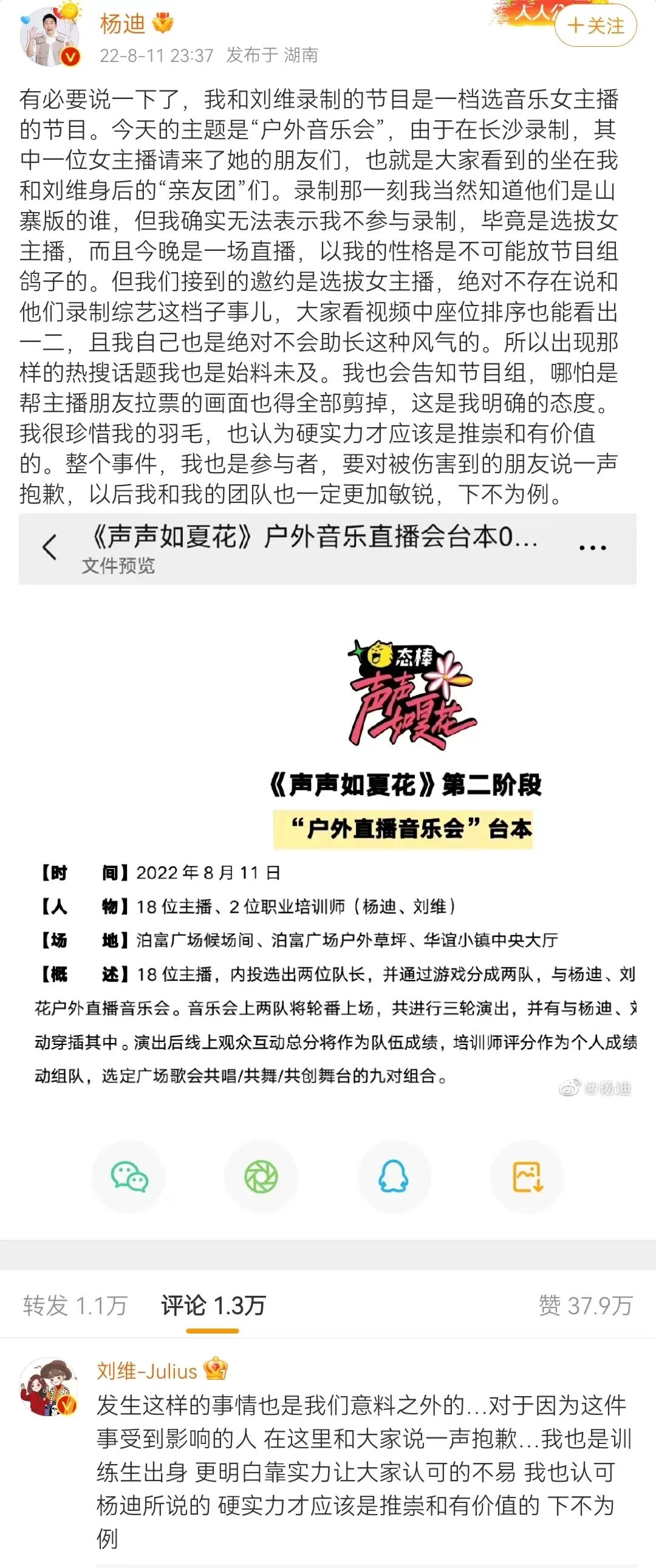 随后杨迪和刘维针对这一事件发表声明,称不会助长这种风气,ESO只是节目嘉宾邀请来的亲友团,他们事先并不知道,并称会告知节目组将他们的画面全部剪掉。