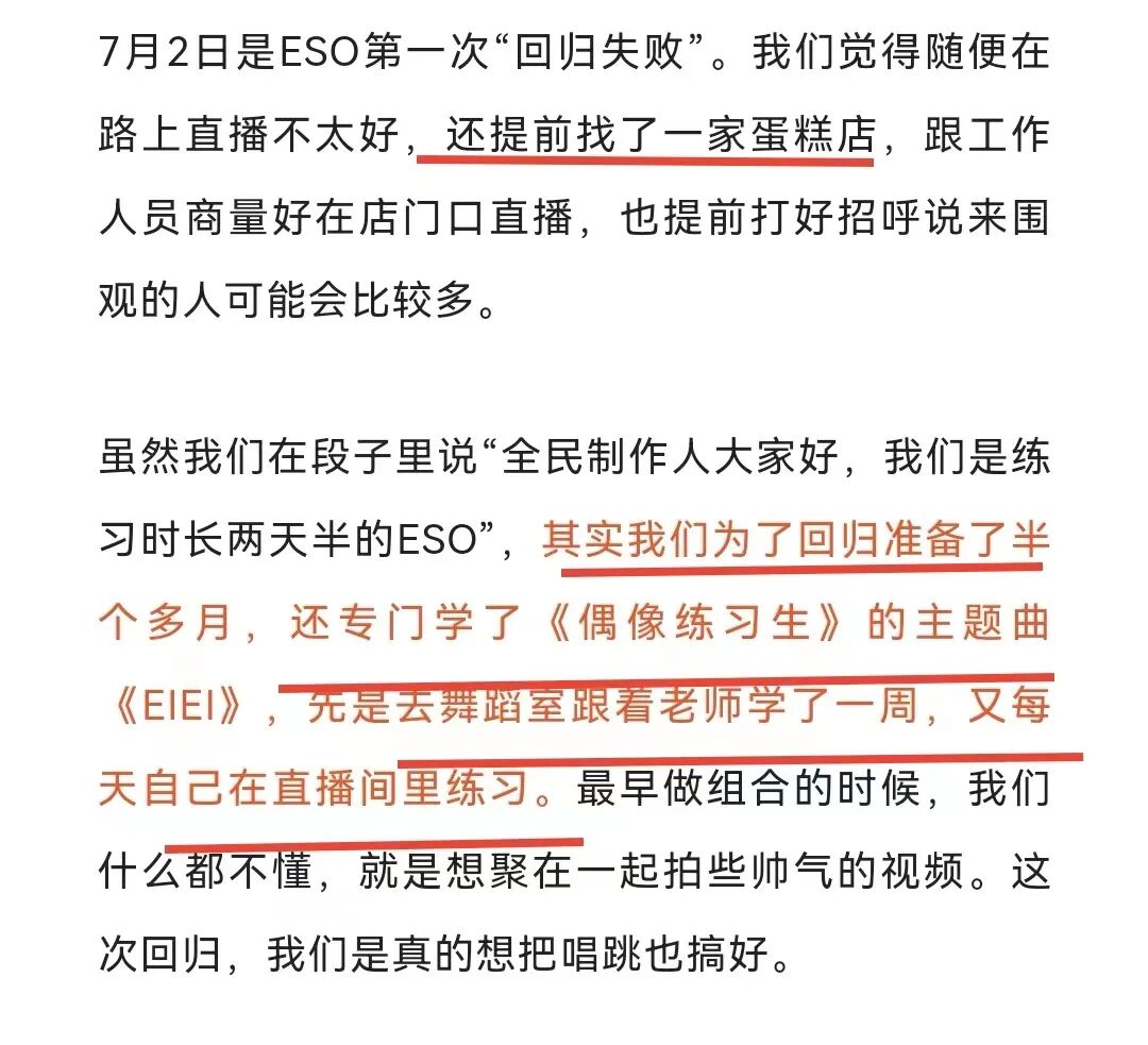 如果这也算“努力”的话,那被ESO模仿的明星们为了仅有的几个出道位而选择在狭小的练习室里练习数年,他们这样的“努力”又算什么呢?