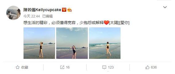 2月13日晚,陈若仪拍了一张漂亮的照片。照片中,陈若仪穿着泳衣站在沙滩上,展示着她美丽的双腿。连粉丝都忍不住问:“这是个仙女?”