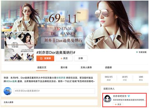 与此同时,#刘亦菲Dior迪奥戛纳行#话题上线,喊话粉丝可以360°围观茜茜公主此次戛纳行。注意,这里可是埋藏着品牌的小心机哟:申请话题的主持人并非品牌方,而是“刘亦菲吧官方”。