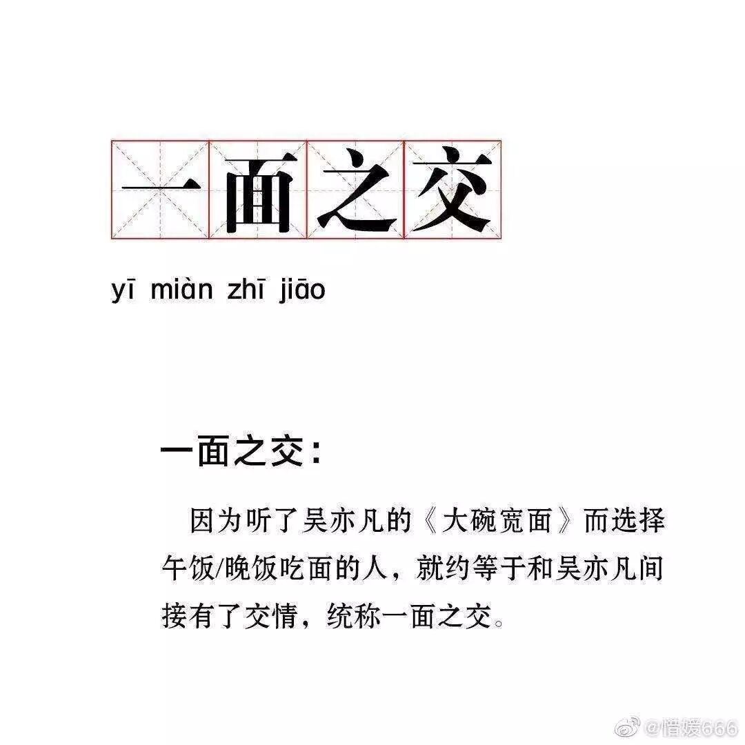 4月19日10时,吴亦凡在自己微博上发布了新歌《大碗宽面》,歌词唱到“何必针锋相对你看这碗又大又圆,相聚就要举杯你看这面又长又宽”,用自嘲和调侃的方式,直面网络上盛行的黑梗。