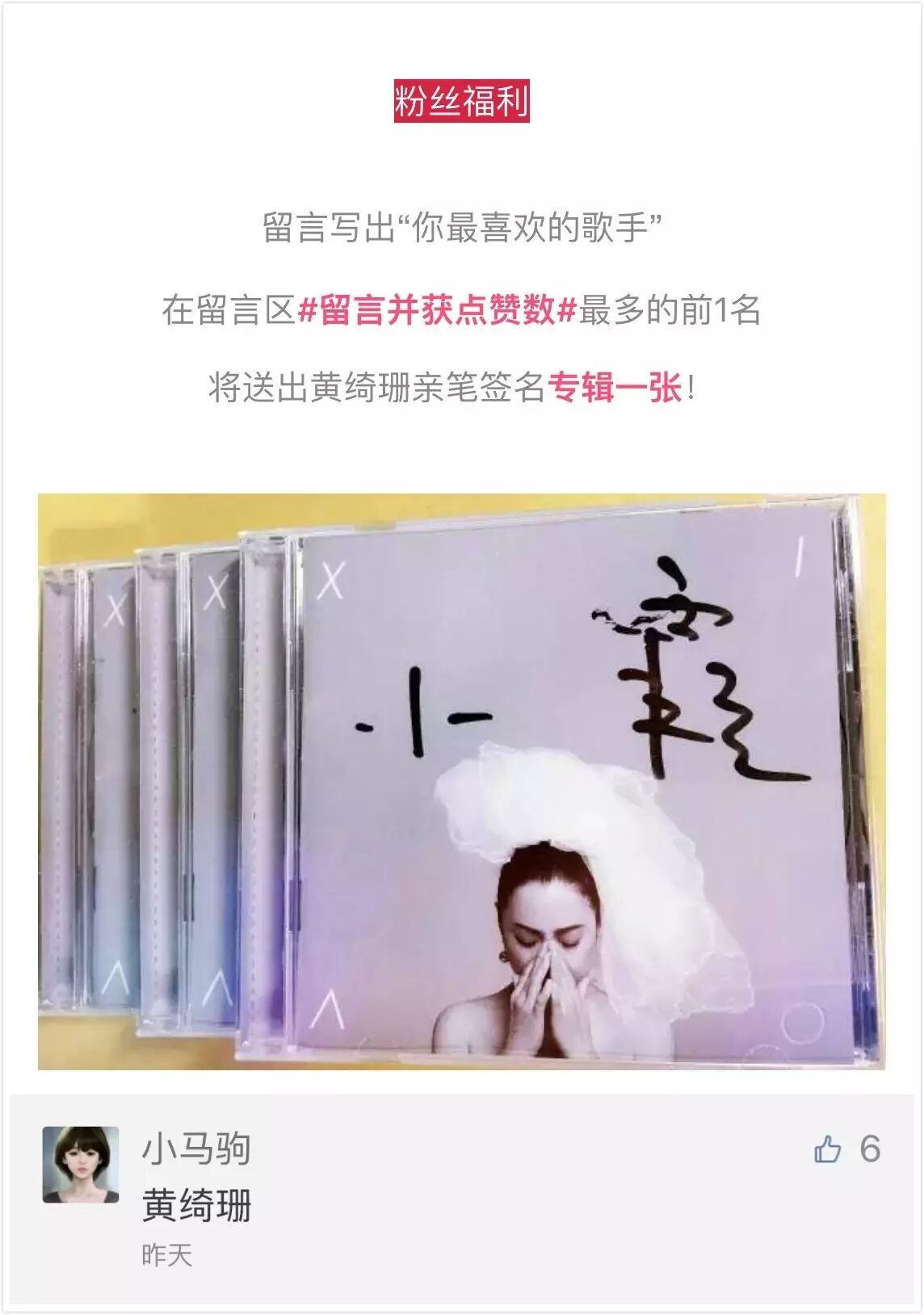 上期“粉丝福利”送签名专辑活动,