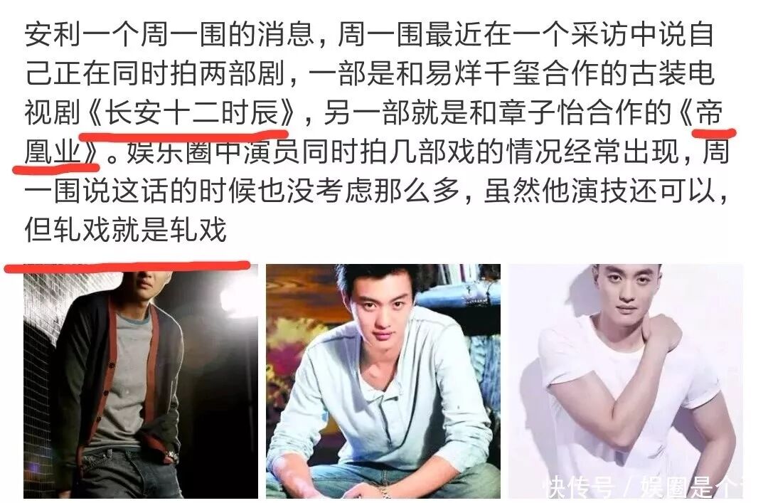 与其相似情况的有周一围,他曾经自曝在拍摄《长安十二时辰》的同时也在拍《帝凰业》,但人们也是在抨击轧戏,并非上升到演员的业务能力。