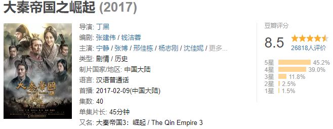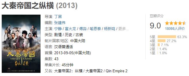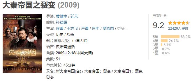 其中包括大家万众期待的《大秦帝国》,由于前几部评分都在8分以上,所以人们对第四部寄予厚望,可想而知有多少人盯着饰演嬴政的张鲁一。