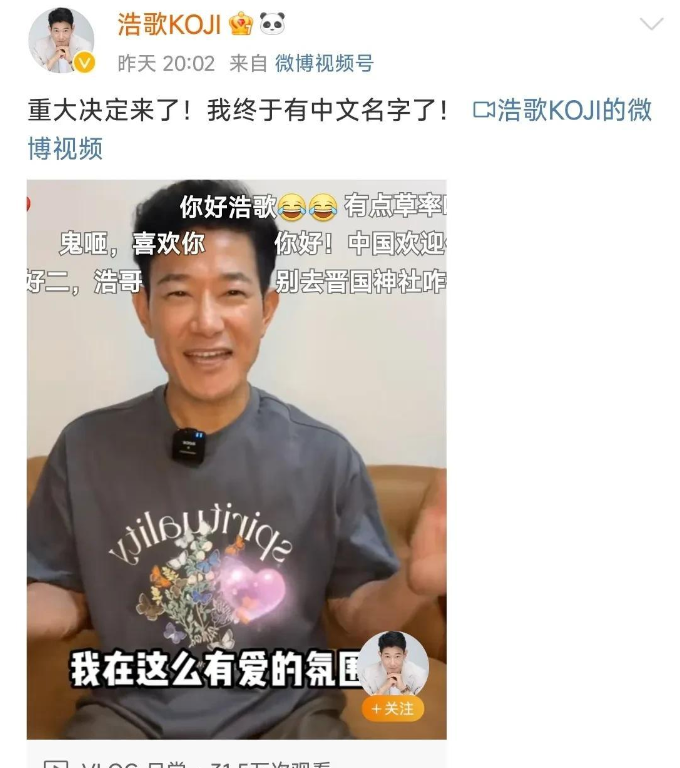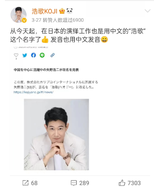 他在三月份就发布通知,之后在中国日本都将采用“浩歌”这个名字,日本使用时发音同样是“浩歌”。