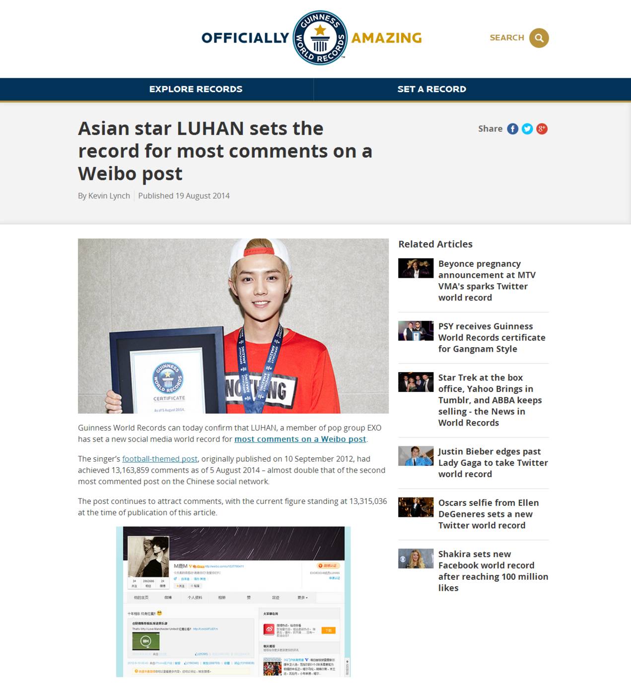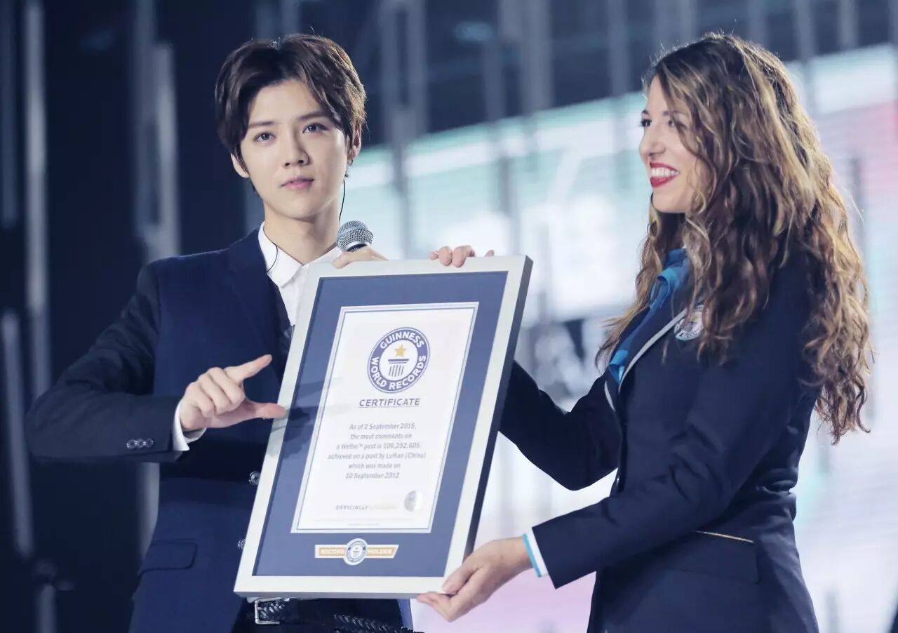 2014年8月,鹿晗个人微博评论创吉尼斯世界纪录,成为中文社交媒体上的首位吉尼斯世界纪录获得者。