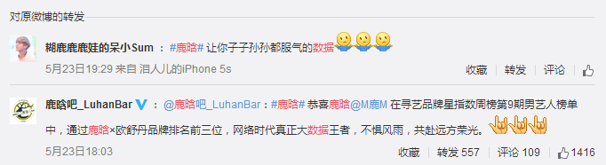 而在2015年9月,吉尼斯世界更是宣布鹿晗的该条微博获得了100252605条评论。(一亿条的评论也让范姐对鹿晗粉丝的强大叹为观止!纪录达成之前,新浪微博最多只能显示9999万条评论,在鹿饭们的反复呼吁下,微博甚至专门为此修改了系统后台。)