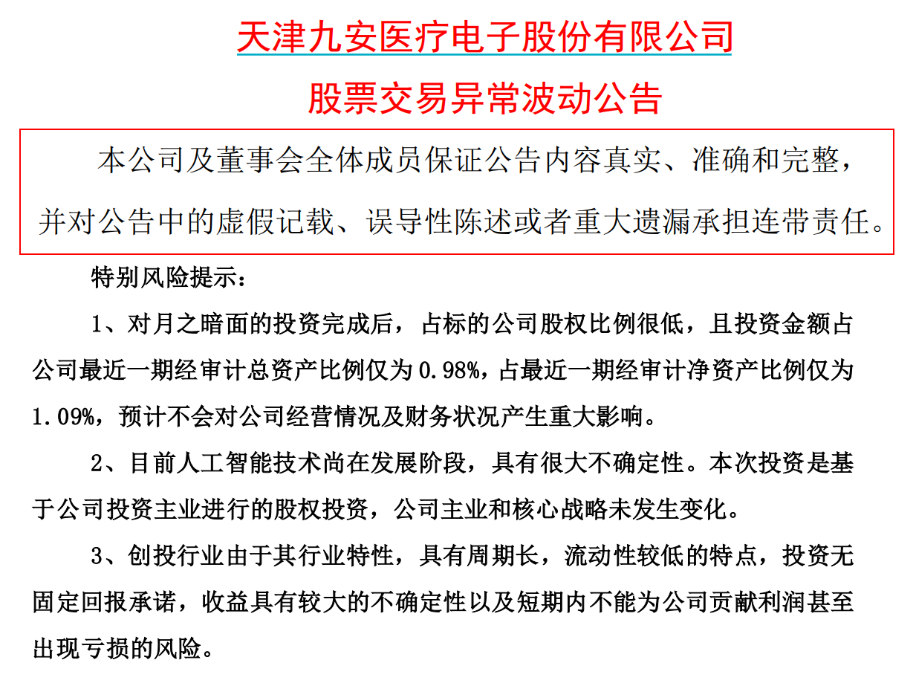 Kimi概念股,官宣! 中国基金报 港台男星 2024-03-24 22:19:49 291 创作不易,用心坚持,欢迎请BaGua喝几杯爱心咖啡!打赏并支持本文 打赏并删除本文 中国基金报记者 文夕 曾经的A股“妖王”,这次盯上AI赛道。 在3月24日,九安医疗在股价异动公告中透露,该公司旗下投资机构分别在去年8月和今年3月出资投资了“当红”AI独角兽——月之暗面。 近日,由于被视为Kimi概念股,九安医疗已在近3个交易日股价大涨逾20%。九安医疗上次“出圈”还是因新冠试剂盒大卖,致使该公司业绩与股价齐飞。 不过,随着海外市场需求下降,九安医疗2023年净利也将大幅下滑,预计下滑超90%。 两主体投资3000万美元占标的公司股权比例很低 国内AI独角兽月之暗面在3月18日宣布,其对话式AI助手产品Kimi智能助手现已支持200万字的无损上下文输入。 这一举动立即引起市场高度关注,国产大模型Kimi由此也带火了一众概念股,其中之一便是昔日A股“妖王”九安医疗。自3月19日起,九安医疗股价起飞。从当日开盘41.96元/股,在4个交易日内一度涨至最高54.98元/股。 在3月24日,九安医疗披露了股价异动公告。该公司透露,在2023年8月,其全资子公司九安香港与月之暗面相关主体签署投资相关协议,投资金额等值于约1000万美元。 同时,在2024年3月,九安医疗参与投资的天津九尚一号管理咨询合伙企业(有限合伙)(简称,九尚一号,九安香港间接份额98.68%)与月之暗面相关主体签署投资相关协议,投资金额等值于约2000万美元。 至于此前为何未予以披露,九安医疗方面解释称,“未达到信息披露标准,预计不会对公司经营情况及财务状况产生重大影响。” 另外,市场此前还传闻,九安医疗参与投资的砺思资本管理的基金向月之暗面进行投资。九安医疗方面称,经核实,砺思资本管理的该期人民币基金目前并未对月之暗面进行投资。 在异动公告中,九安医疗也予以澄清,称对月之暗面的投资完成后,占标的公司股权比例很低,涉及的金额占公司最近一期经审计总资产比例仅为0.98%,占最近一期经审计净资产比例仅为1.09%。 此外,九安医疗表示,目前人工智能技术尚在发展阶段,具有很大不确定性。“本次投资是基于公司投资主业进行的股权投资,公司主业和核心战略未发生变化。” 突然发力股权投资 需要提及的是,九安医疗自2022年以来突然对股权投资产生了浓厚兴趣。 早在2022年9月,九安医疗一口气出资了5家VC/PE,投资总计3.4亿元。这5家机构分别是济峰资本、元生创投、武岳峰资本、耀途资本、汇芯投资。按照当时公告显示,上述5家机构投资方向主要为医疗健康,以及信息技术、先进制造、新材料等科技领域。 一年之后,在2023年11月,九安医疗又一口气出资了4家VC/PE,分别是砺思资本、奇绩创坛、英诺天使基金、九合创投,投资总计1.5亿元。 相比上次出资,这次九安医疗的策略有了新变化,金额更少、阶段更清晰、方向更明确。九安医疗方面表示,上述4家机构在VC/PE圈子阶段早期,且均关注人工智能。 而短短一个月之后(12月29日),九安医疗又公告宣布,其全资子公司九安香港使用自有资金,与一家名为尚势投资的机构共同设立九尚创投。同时,九尚创投及尚势投资共同设立“九尚一号”。 当时九安医疗方面透露,九安香港拟投3.13亿元人民币或等值美元,投资的目的是以九尚一号为主体向境内创业投资型基金、初创企业等进行投资。而九尚一号即为向月之暗面投资的主体之一。 从上述经历来看,九安医疗对月之暗面的“押宝”,也得益于其去年在创投领域的一系列布局。 “暴富”后业绩下滑逾九成 九安医疗在资本市场上的高光,还要追溯到新冠疫情期间。 九安医疗所处行业为IVD及家用医疗健康产品领域、互联网医疗领域。在2021年-2022年间,由于其产品iHealth新冠试剂盒产品在美国销量大增,九安医疗股价在半年时间内一路飙涨,暴增15倍,被投资者一度称为A股“妖王”。 正是由于产品大卖,九安医疗业绩也出现暴增。在2020年和2021年,该公司归母净利润仅为2.42亿元和9.09亿元,而仅仅在2022年一季度,其归母净利润便激增至160.3亿元。 不过,赚得盆满钵满的九安医疗,并未延续其高光时刻。在今年1月29日,九安医疗披露2023年年度业绩预告,其预计2023年归母净利润为11亿元-13亿元,同比下降91.89%-93.14%。 九安医疗解释称,原因主要是常态化后,美国市场对iHealth体外诊断检测产品的需求下降所致。 而九安医疗也极度依赖iHealth这一单一产品。根据该公司2023年半年报显示,iHealth系列产品为该公司第一大收入来源,占比达到93.92%。 九安医疗也在2023年半年报中提及,公司的抗原家用自测试剂盒产品的需求情况与美国市场需求情况直接相关,同时受到当地政策和市场竞争环境等情况影响,上述情况的变化将可能较大幅度造成试剂盒产品市场需求减少,造成公司业绩波动的风险。编辑:小茉审核:木鱼版权声明《中国基金报》对本平台所刊载的原创内容享有著作权,未经授权禁止转载,否则将追究法律责任。授权转载合作联系人:于先生(电话:0755-82468670) 创作不易,用心坚持,欢迎请BaGua喝几杯爱心咖啡!打赏并支持本文 打赏并删除本文 感谢您的支持鼓励,我会继续努力的!文章地址:用户邮箱:打赏金额:USDT 请输入数字点击”去打赏“,即可进行打赏支持本文章哦 kimi 发表评论