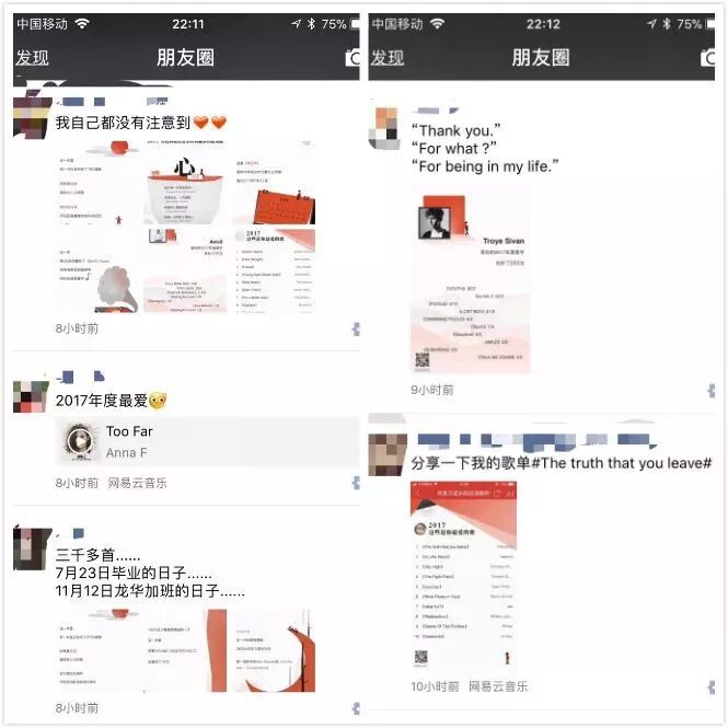 @M沈卿:今天朋友圈被网易云年度听歌报告刷屏,我只想说,美团饿了么百度糯米大众点评请不要这样。我不想看到“这一年你一共点了多少次外卖”,也不想看到“XX天你睡得特别晚 半夜三点了你还在点外卖”,“2017年你最爱的外卖是XXX” ……