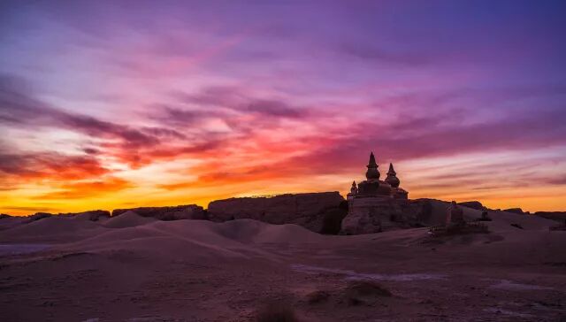 黑城怪树林景区包括黑城古遗址和怪树林这两大景点,黑城是丝路上现存最完整、规模最大的古城遗址,如今已是残垣断壁,漫漫黄沙和五座古老佛塔是其最主要的看点。怪树林全是一些枯死的胡杨树,它们或挺拔,或佝偻,是拍摄夕阳下胡杨剪影的最佳地点。去怪树林最合适的时间是下午,一般国庆期间是额济纳最美的季节,这时候几乎天天都是晴天,所以下午前往怪树林能拍到很棒的景色,特别适合逆光拍剪影。