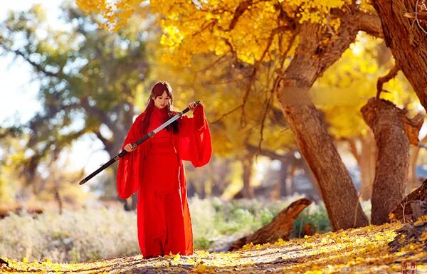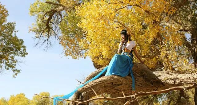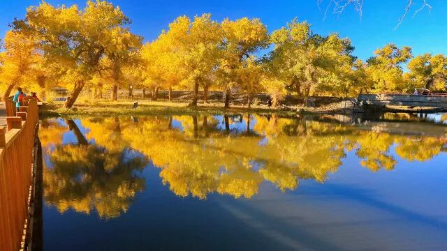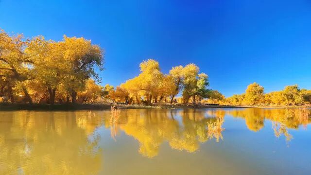 3、 选择好衬托物:以天空的蓝色,加上白云的点缀,衬托出胡杨林的金黄色,照片看起来跟有味道,增加视觉冲击力;以湖水为背景,贴近湖面,拍摄出大小不一的金黄倒影;
