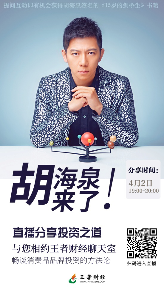 4月2日,胡海泉即将莅临王者财经聊天室,分享他的成功投资之道。胡海泉,大家熟悉的明星偶像、音乐人、歌手,这次他以另外一个身份投资人,讲述在投资路上的心得经验,讲讲这些年他在投资这条路上的思考和总结,畅谈消费品品牌投资的方法论。王者财经致力于为中国的中小投资者提供包括财经数据与资讯、投资培训、理财服务等一系列的全面服务。王者财经搭建平台让王粉聆听更多业界大咖的投资理念,包括这次邀请胡海泉来王者财经演讲直播也是为王粉谋取的福利。