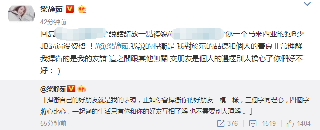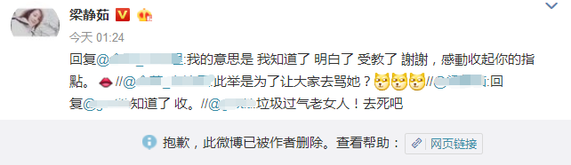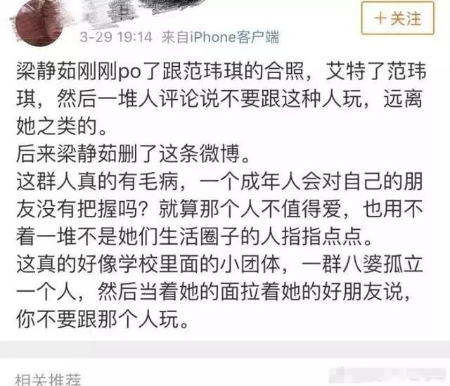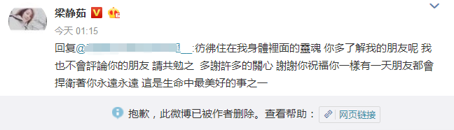 结果评论下一众网友留言,说范玮琪心机很重,不要跟这种人玩。梁静茹立刻删除微博,并拉黑了所有在下面说三道四的人,包括粉丝。