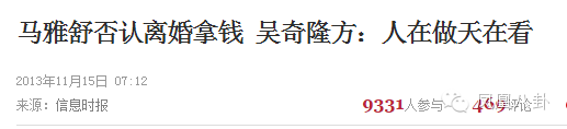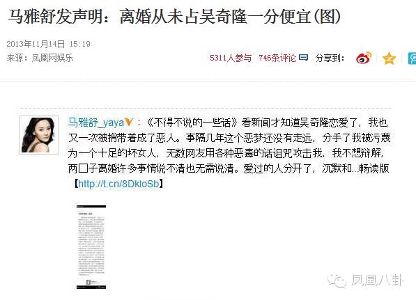 2013年吴奇隆、刘诗诗公开承认恋情之后,前妻马雅舒再次被提起。报道又称,吴奇隆隆当年以六个物业和100万赡养费换取自由,而与马雅舒离婚四年,一直每月还坚持银行汇钱给马雅舒,生活费不断。