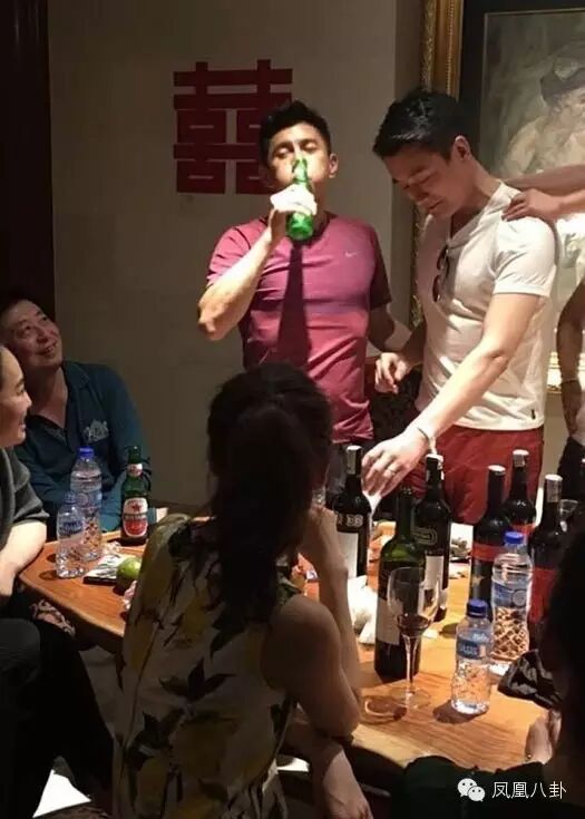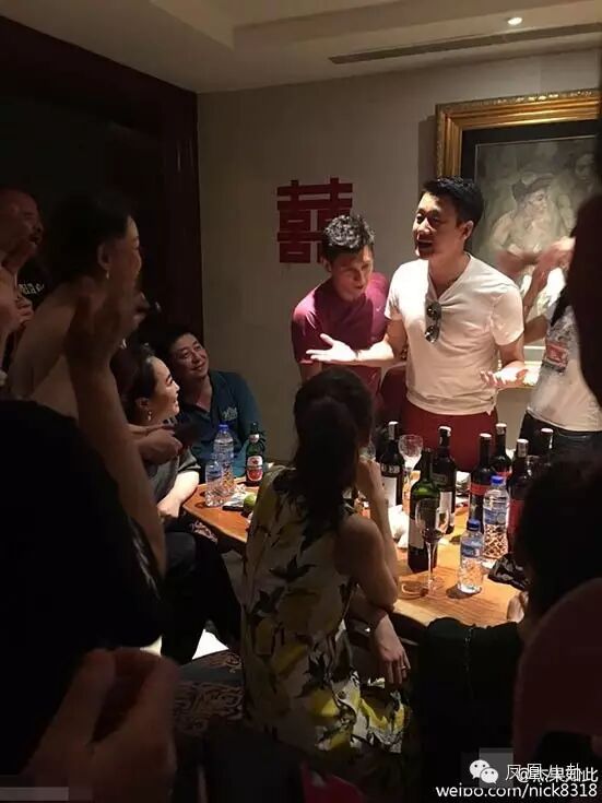 今天,两人大婚当日婚宴后的聚会照片曝光了,一众好友在一起,就像平时朋友聚会喝酒一样。吴奇隆还好豪气地表演“吹喇叭”喝酒,跪在地下送礼物给老婆刘诗诗,场面相当搞笑。