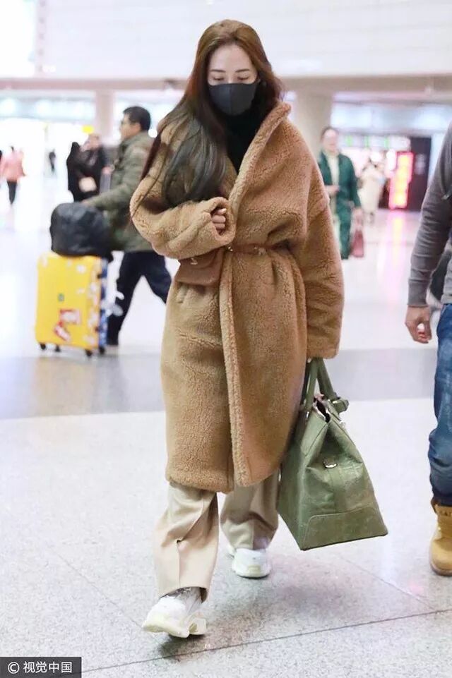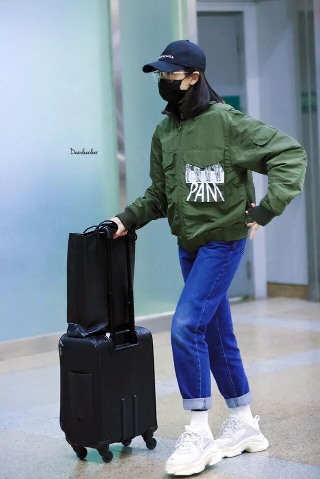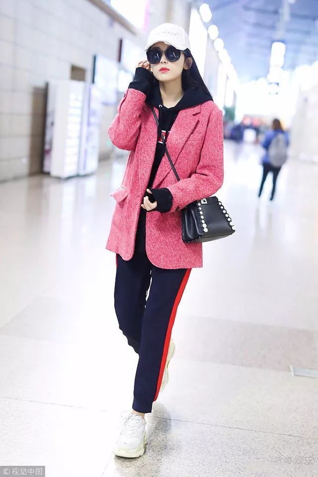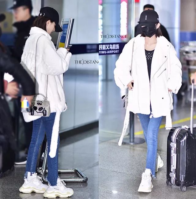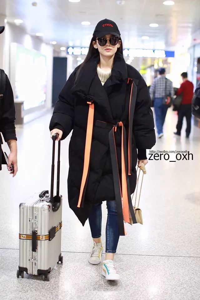 娜扎小白鞋上的条纹和羽绒服的带子呼应,让黑色大衣看起来也少了沉闷感。