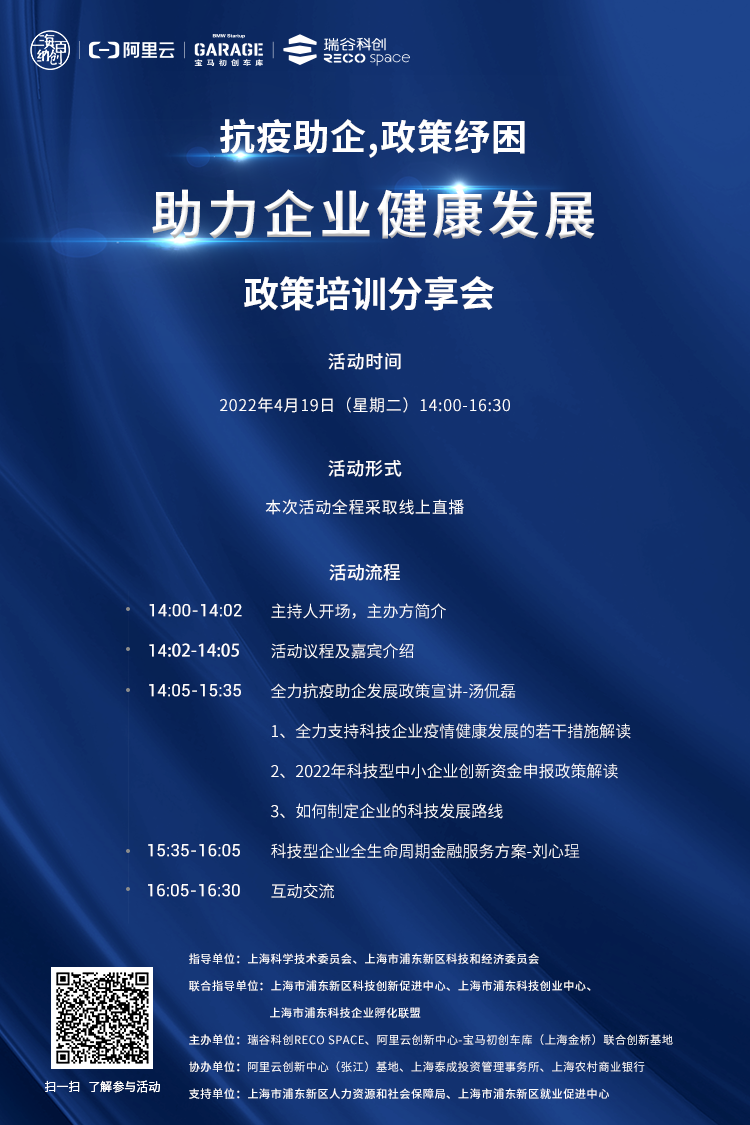 为助力科创企业渡过疫情难关,恢复平稳发展,阿里云宝马联合创新基地举办本次线上政策培训分享会。本次活动特邀上海市经信委中小企业服务专家汤侃磊,为科创企业解读近期市区出台的各项助力企业纾困解难的政策,进一步做好政策推广覆盖,促进政策实效落地。