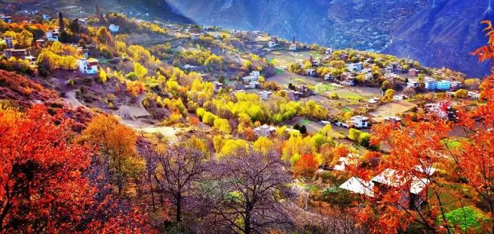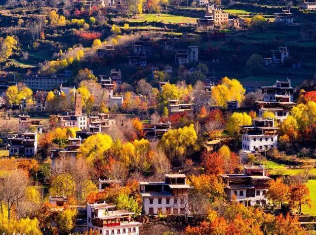 走进丹巴,每一幢房子如一颗珍珠,恰到好处地散落在山间,缤纷秋色与栋栋小屋相映成趣。