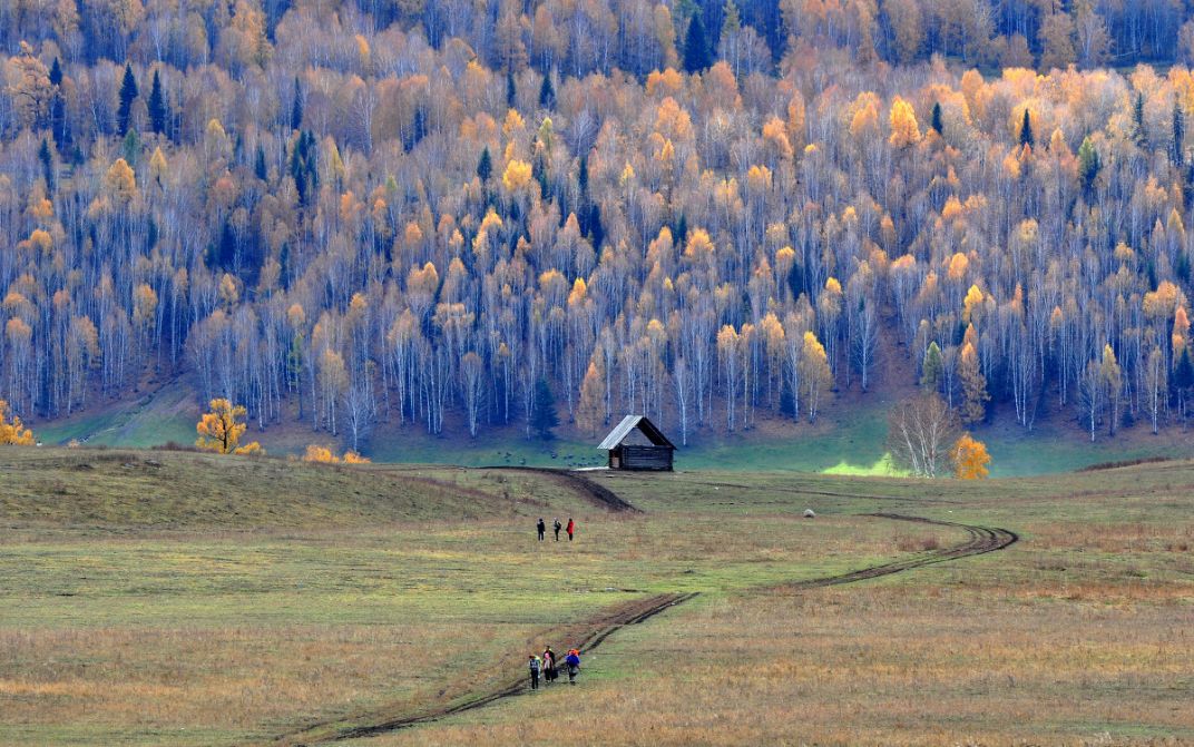 在禾木村周围的小山坡上可远观日出、雪峰与涓涓溪流,近览图瓦人家,层林浸染,绚丽多彩。