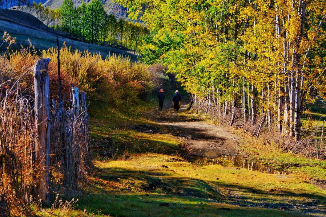 村在林中,林在村中,仿佛进入了金色的童话世界,叶刚好落在肩头,时光就这样慢慢的流淌着。