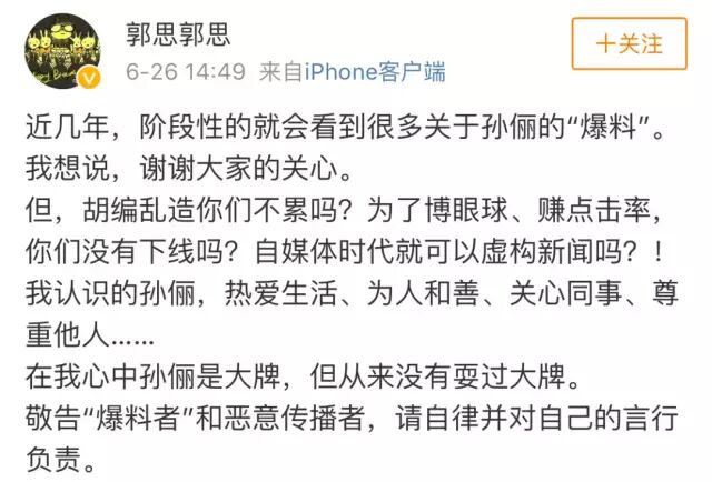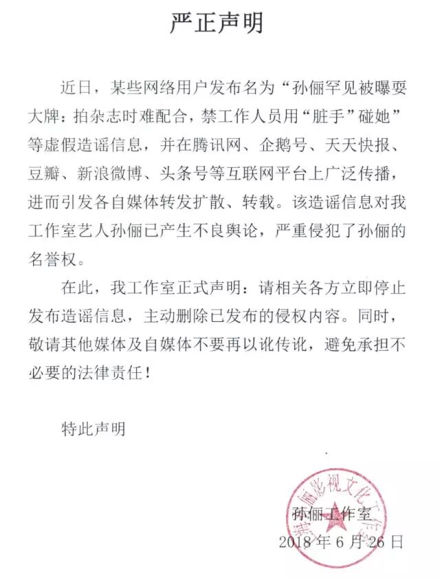 整个事件的大概意思就是在说,孙俪在拍杂志时难配合,禁止工作人员用“脏手”碰她。眼看着事件逐渐发酵,最后经纪人直接出来澄清虚构新闻。