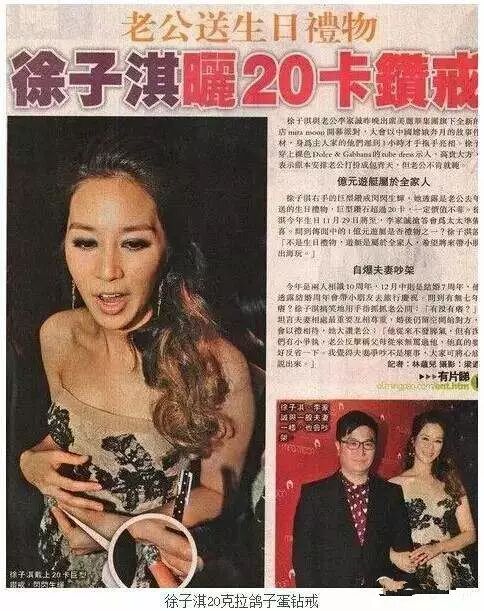 2012年徐子淇生日,老公李家诚就送了她一颗20克拉的鸽子蛋;