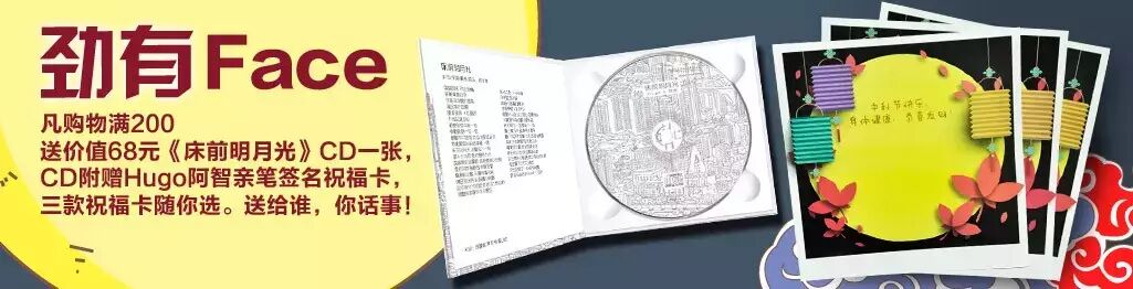 凡购物满200送价值68元《床前明月光》CD一张,CD附赠Hugo阿智亲笔签名祝福卡,三款祝福卡随你选。