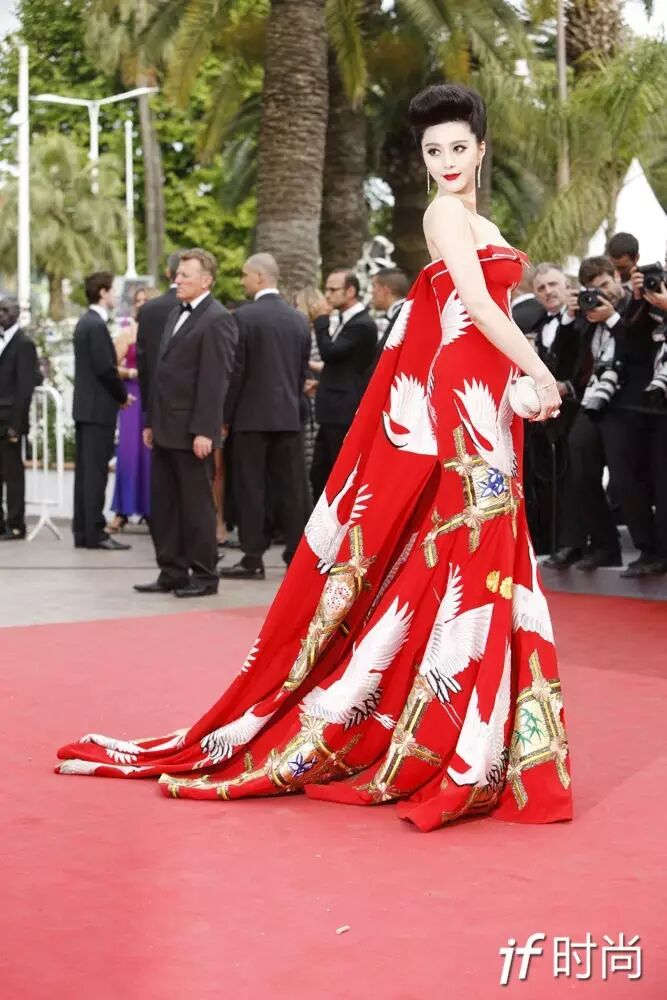 ▲2011年范爷再次以充满中国色彩的晚装裙亮相,白嫩的肌肤、复古的红唇搭配红色仙鹤装让她成为全场焦点。