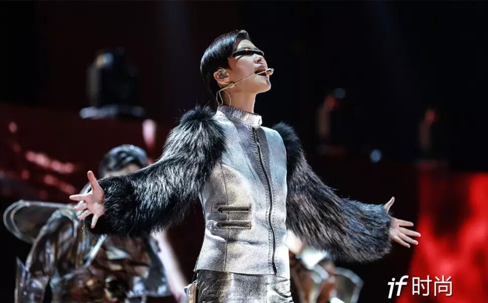 ▲在去年的Why Me演唱会上,充满未来感的开场装扮便是老佛爷为她打造的“银之月”劲装,袖子处华丽的皮草,上衣、裤子的银色皮革让人印象深刻。