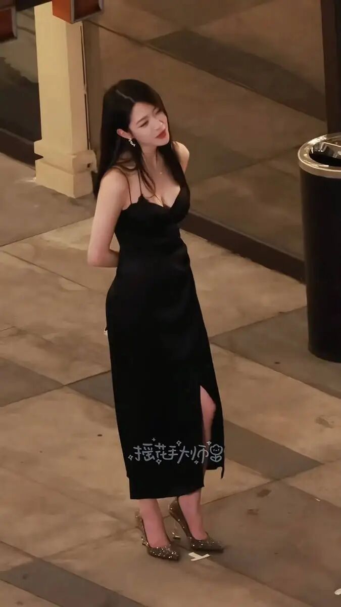 从现场拍摄的多个角度照片来看,这条黑丝绒裙的设计堪称精妙。裙身采用高腰剪裁,在视觉上拉长腿部线条,而背部大面积镂空设计则以细腻的丝绒绑带固定,既保证活动自如又增添几分慵懒的性感。最引人注目的是裙摆处的斜向开衩,从大腿中部延伸至脚踝,行走时若隐若现的腿部线条与丝绒面料摩擦产生的光泽感形成微妙互动。有服装设计师分析指出,这种开衩角度经过精确计算——既不会因过高显得俗艳,又避免过低失去视觉冲击力,堪称"心机与优雅的完美平衡"。