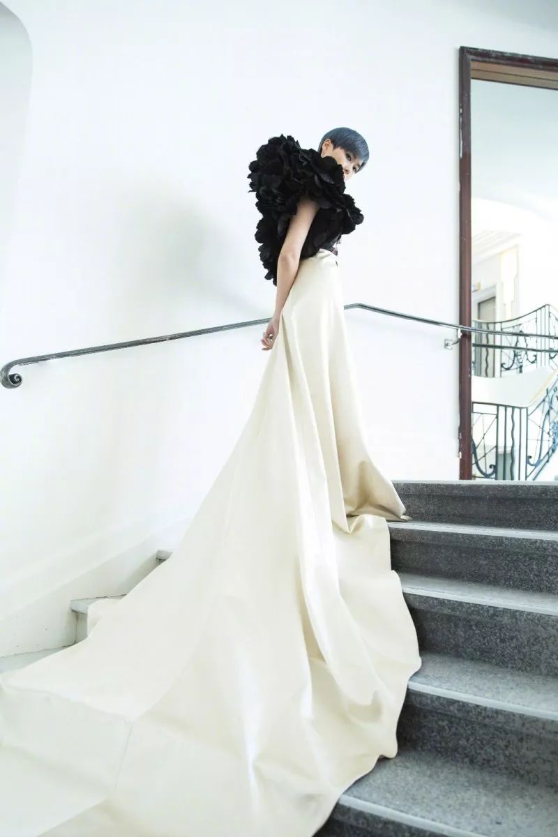 卢靖珊此次亮相戛纳,身穿Stephane Rolland白色裤裙礼服,又酷又率性。看似很平常的礼服,下半身确是设计感满满。