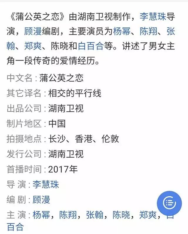 百科上介绍的一清二楚,电视剧《蒲公英之恋》又名《相交的平行线》是根据著名青春小说作家顾漫的同名小说改编,由杨幂、陈翔、郑爽、张翰、白百合、陈晓领衔主演。