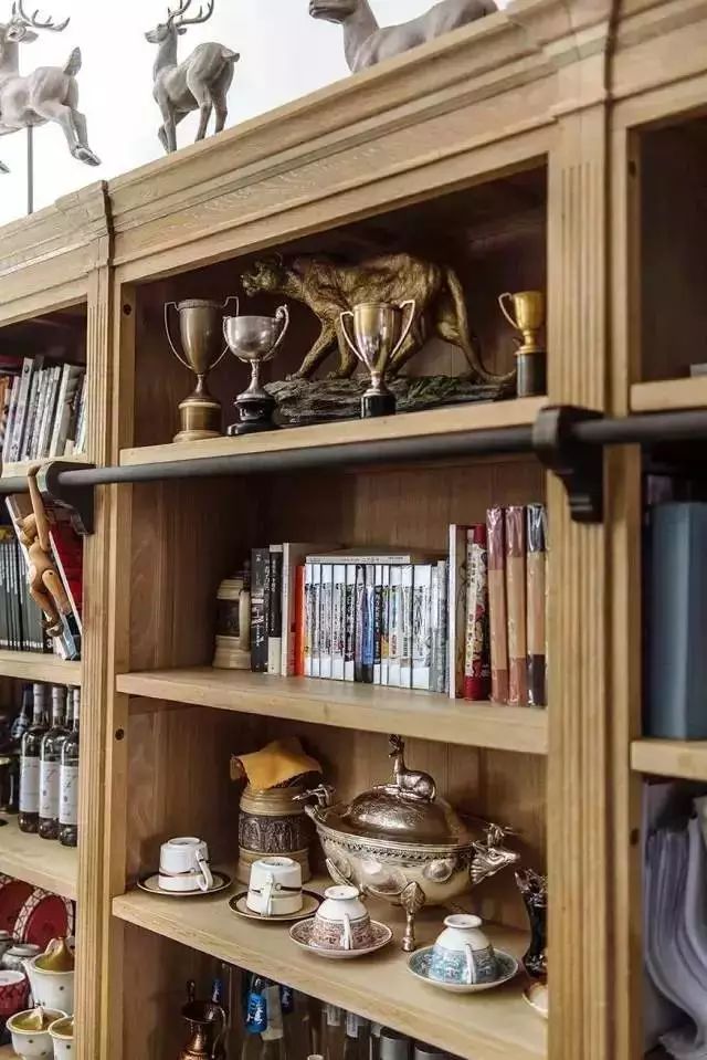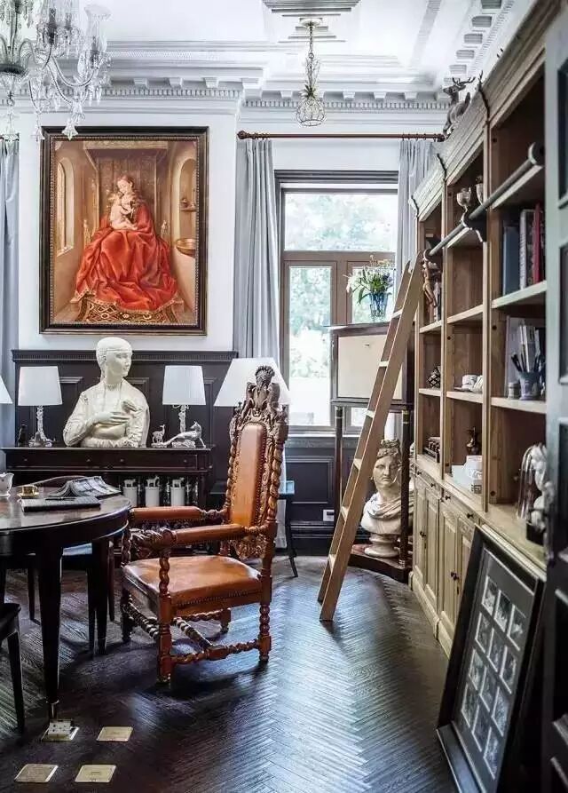 奢华大气的巴洛克水晶灯,深棕色实木家具,爱马仕墙纸,各种各样的杯盏交错都完美地呈现了一个复古宫廷的书房风格。