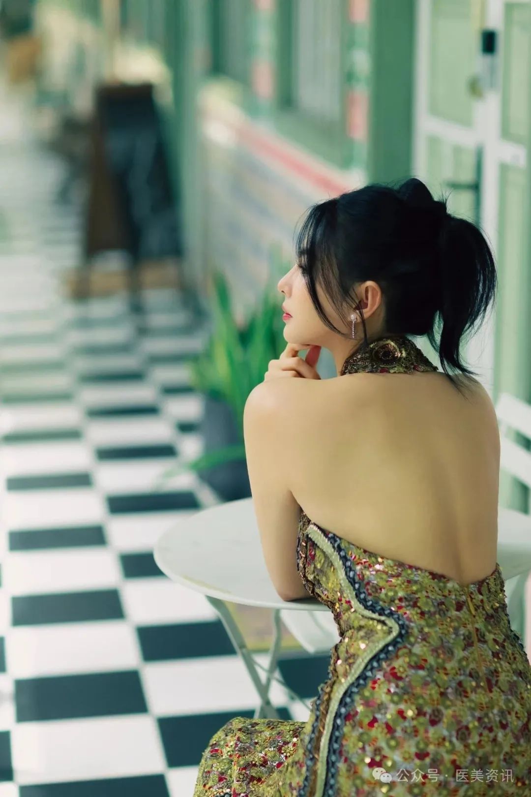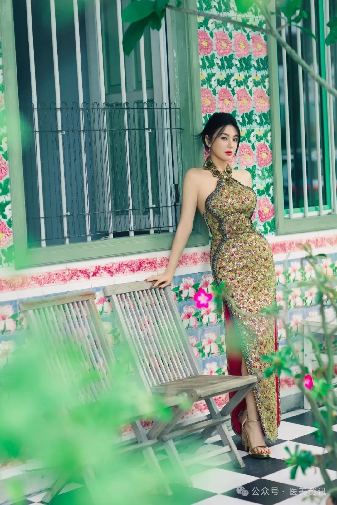 从挂脖的孔雀眼斑元素到裙摆的精致剪裁,她的旗袍,如同她的人生,不拘一格,充满力量。同色系的高跟鞋,更是将这份优雅与精致推向了极致。