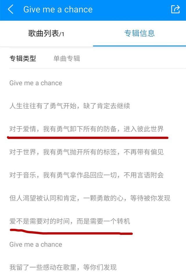 最耐人寻味的是,专辑单曲介绍里,明确说出:“对于爱情,我有勇气卸下所有的防备,进入彼此世界”、“爱不是需要对的时间,而是需要一个转机”......