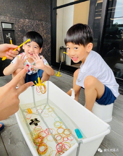 林志英与大儿子基米竞争,而双胞胎则坐在一旁“看战争”。四父子相处得很好。画面温暖而充满爱意。