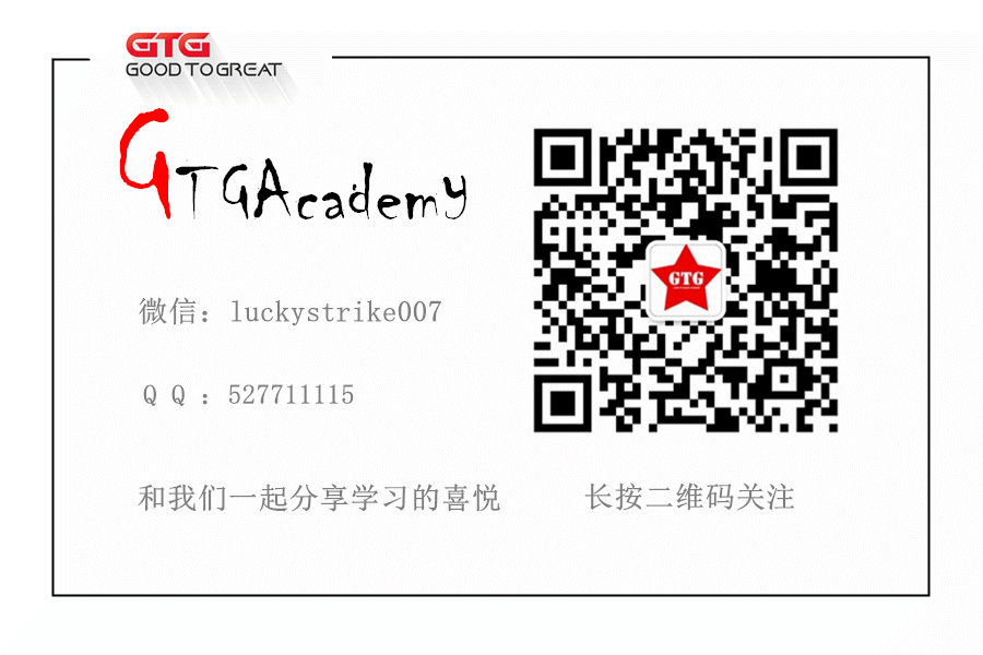GTG,全称为GOOD TO GREAT Academy,是一个充满活力正能量的微学平台,有数不清的时差党,优秀的教育工作者,还有一群最可爱的志愿者,鼓励大家利用琐碎时间来学习成长,旨在帮助更多对英语语言学习有需要的朋友们。