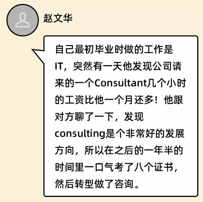 从IT到咨询,这个跨度确实蛮大的。从赵先生的访谈中,我们可以知道,他是勇于跳出舒适区的人,也是对自己狠的人。