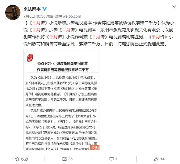 《芈月传》开拍之前,编剧蒋胜男的小说《大秦太后》,只是有7000字的大纲。但电视剧《芈月传》播出之后,未经制作团队同意,蒋胜男擅自将该剧的内容改编为小说,抄袭该剧的部分内容并出版。严重侵犯电视剧《芈月传》剧本的著作权,索赔2000万元。