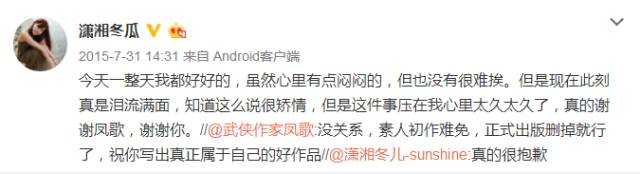 事情发生以后,潇湘冬儿即刻回应,在表示内疚愧疚之后,得到了凤歌老师的谅解。