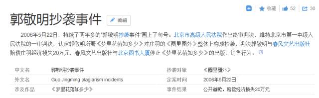 2006年的抄袭事件,可以说成为了郭敬明作家生涯上伴随终生的标签。《梦里花落知多少》抄袭庄羽的《圈里圈外》,在法院判决生效下,郭敬明至今拒不道歉。